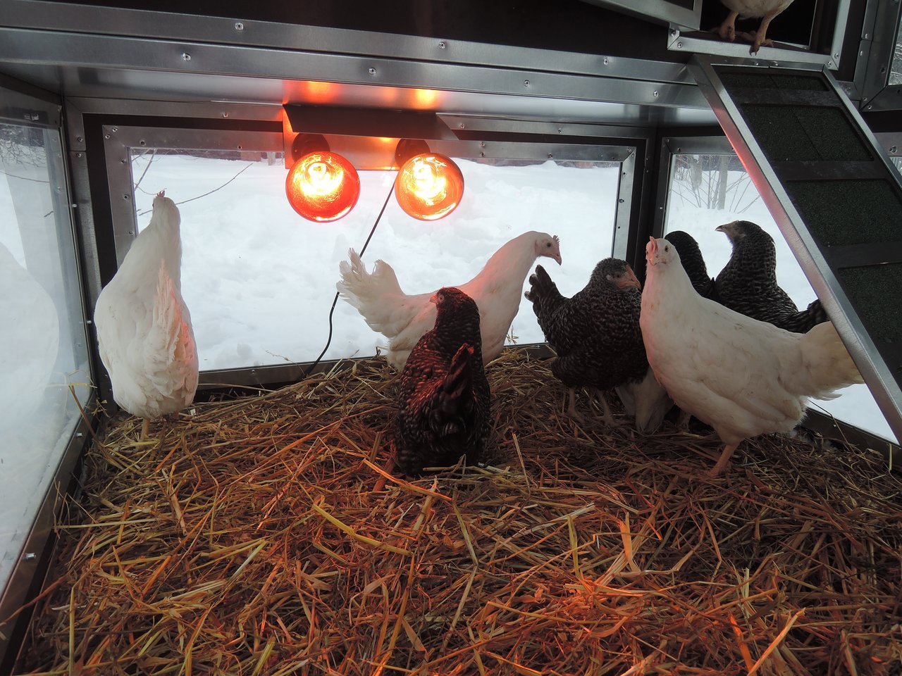 Если курятник площадью не превышает 12 м², то можно использовать инфракрасные лампы мощностью лишь 250Вт. Небольшие затраты на использование лампы столько малой мощности, позволяют не выключать их в зимний период времени, когда, объективно, естественного освещения в курятнике недостаточно.