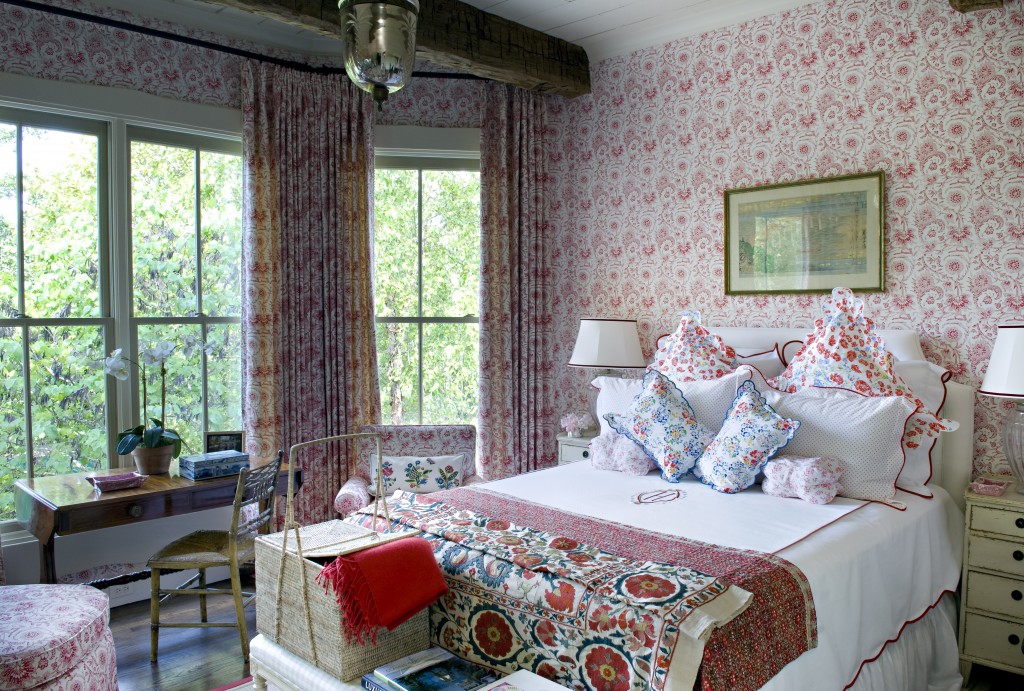 интерьер спальни в стиле прованс с ярким и мелким цветочным рисунком