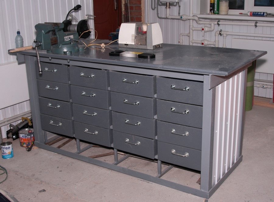 Благодаря этому приспособлению вы сможете максимально удобно организовать рабочее пространство. Верстак удобнее и проще всего собирать из древесины. На рабочую зону рекомендуется уложить и закрепить лист металла, чтобы защитить дерево от быстрой порчи.