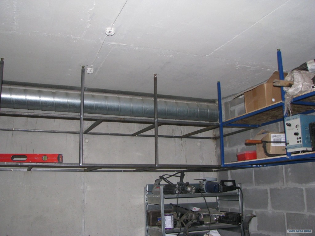 просторный гараж обустроен подвесной мебелью и автоматическими воротами