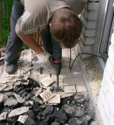 Если поверхность открытого балкона имеет старую цементную стяжку, ее необходимо демонтировать. Это нужно делать очень аккуратно, чтобы не задеть плиту. Лучше всего этот процесс провести с помощью перфоратора.