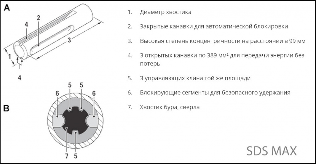 Технологию зажима патрона SDS max понять можно, если внимательно рассмотреть хвостовик бура или зубила. Патроны SDS max имеет 5 пазов, открытые совмещаются с направляющими шлицами, которые расположенными внутри патрона. С их помощью осуществляется непосредственная передача крутящего момента. Для перемещения наконечника по шлицам не предусмотрено дополнительной фиксации. Закрытые пазы совмещаются с шариковыми зажимами, которые необходимы для удержания наконечника, нагрузки на фиксаторы нет. Удар передается на рабочий наконечник посредством его торца.