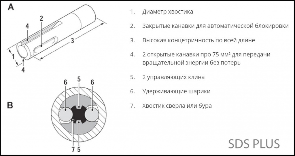 Если патрон для электродрели обладает в основном цилиндрической конфигурацией хвостовика, то у перфоратора он имеет иной облик. В хвостовой части имеется 4 углубления в форме пазов, расположенные на равной дистанции между собой. Два углубления с торца имеют открытый вид, иными словами, выемка проходит по всей протяжённости хвостовика, а два других — закрытого типа. Открытые пазы служат в качестве направляющих насадки, вставляющейся в патрон. За счёт закрытых пазов производится фиксация насадки. Для этого в структуре изделия учтены специальные шарики.