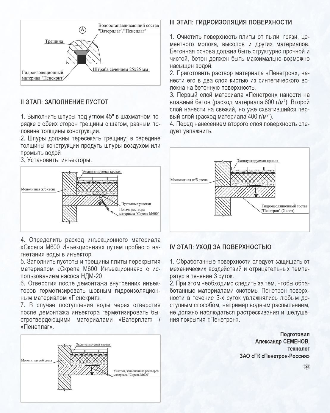 Внимание! Не забудьте, что для гидроизоляции трещин, швов, стыков, сопряжений, примыканий, вводов коммуникаций нужно использовать шовный гидроизоляционный материал «Пенекрит» (12.2), а для остановки напорных течей – материалы «Пенеплаг» или «Ватерплаг» (12.4)