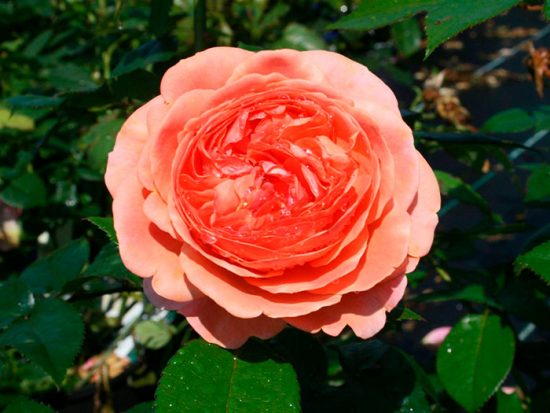 Куст этой розы сильнорослый, мощный и раскидистый. В высоту может достигать 1-1,2 м, а в диаметре – около 1 м. Листья темно-зеленой окраски, глянцевые. Цветки крупные, до 12 см. Лепестки махровые, сначала окрашены в насыщенные оранжево-розовые тона, затем на солнце выгорают, становясь персиковыми. Цветет все лето до самых заморозков и второй волной не менее обильно, чем в начале сезона. Отличается нежным ароматом с фруктовыми нотами.