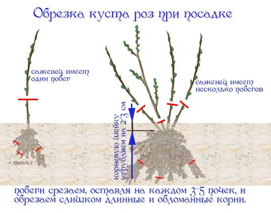 Посадочная яма 0,5 х 0, 5 х 0,5 м выкапывается за 7 дней до высадки. В яму заливается вода, что дает возможность почве достаточно промокнуть. Почвенная смесь готовится из соотношения 2 к 1 грунт к перегною. В получившуюся смесь вводится специальное удобрение для роз. Готовится саженец методом укорачивания побегов (оставив на каждом по 3-5 ростовые почки), удаления слабых приростов. На сутки корни саженцев нужно поместить в воду, рекомендуется с добавлением биостимулятора для роста. На дне ямы устраивается дренаж, который будет защищать растение от застоев влаги. Выкопанная земля перемешивается с перегноем (1 к 1). Часть подготовленного грунта насыпается на дренаж «холмиком». Посадка может осуществляться в мае (ближе к середине месяца). Перед тем как высадить растение его корни обрезаются до длины в 0,3 см (если требуется), можно корни обсыпать древесной золой