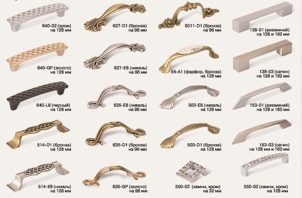 Ручки. Главным критерием выбора ручек для гарнитура является качество ее материала изготовления и исполнения. Чем качественнее ручка, тем дольше она прослужит. Различают следующие виды ручек: плоские, шарообразные, дугообразные, призматические, ручки-скобы, ручки-кнопки и так далее. Все они различны по цвету, дизайну и фактуре. Самый популярный материал для фасадных ручек и ножек – это металл (алюминий, нержавейка, цинковое литье) и пластик, хотя сейчас получил особенно широкое распространение и востребованность фарфор. Мебельные ручки подвержены большой механической нагрузке, поэтому требуют стойкого защитного покрытия, улучшающего эксплуатацию и увеличивающего срок службы данного изделия