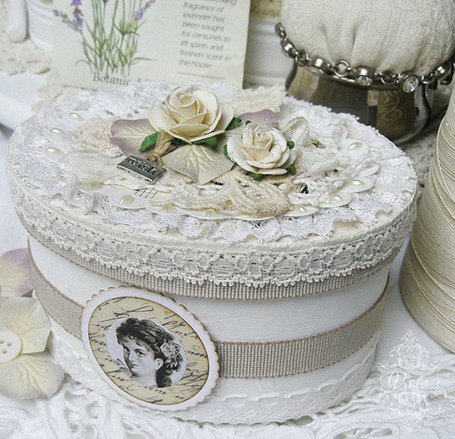 • Крышку так же оклеиваем и украшаем кружевными лентами.