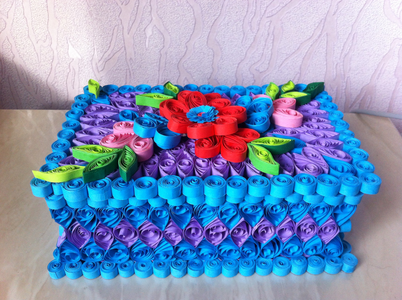 • Когда внутренняя часть готова, можно приступать к работе с внешним слоем. Стильно будут смотреться квадратики разной цветовой гаммы с узорами. Перед укладкой крайнего ряда следует наклеить ленточку, которая будет выступать в качестве завеса для фиксации крышки.