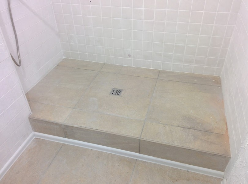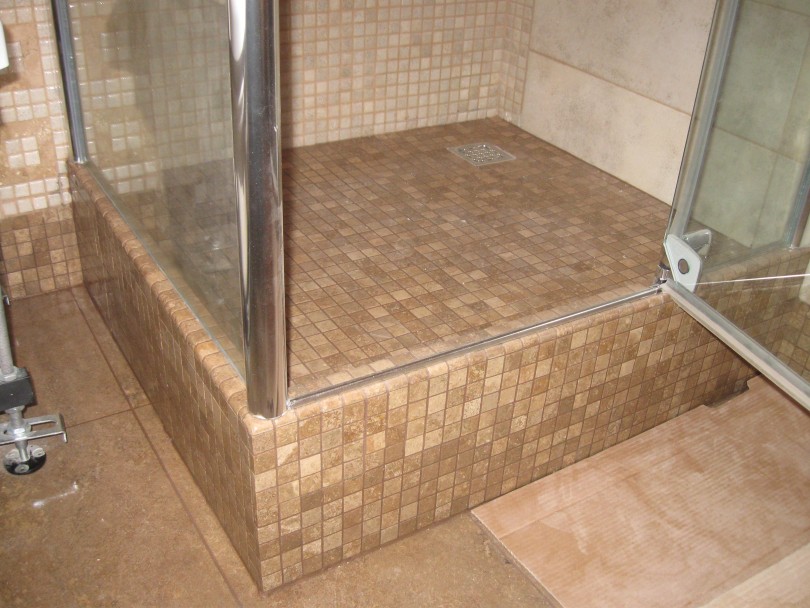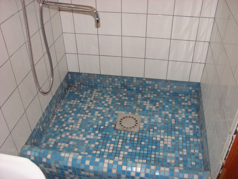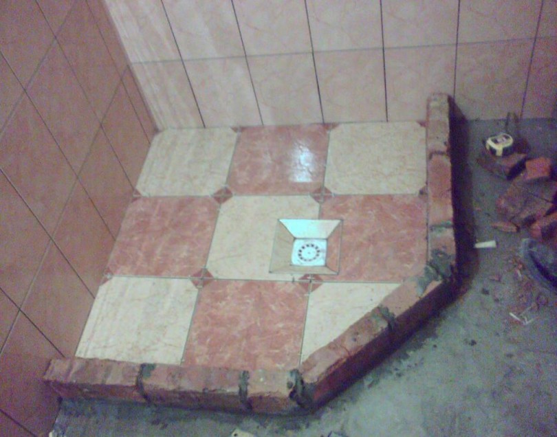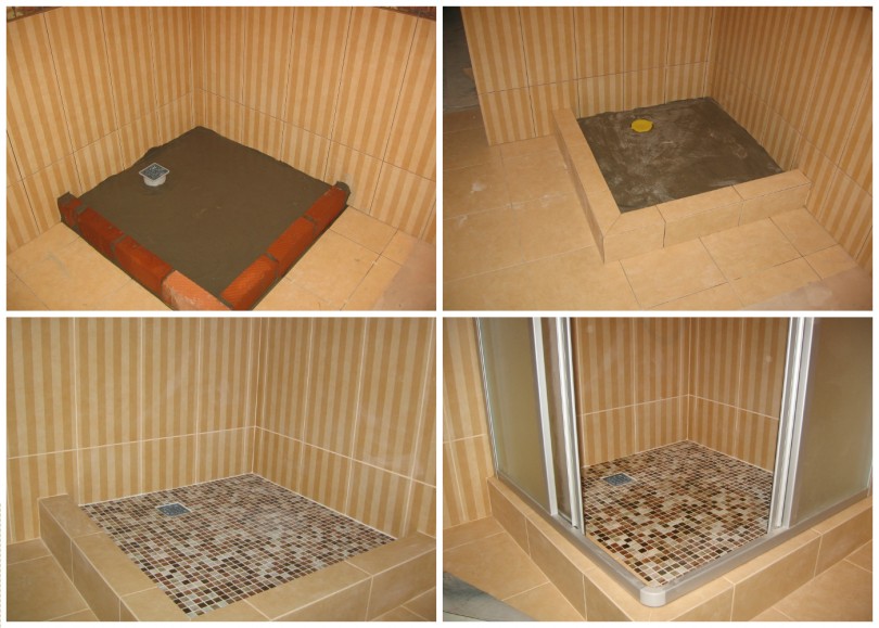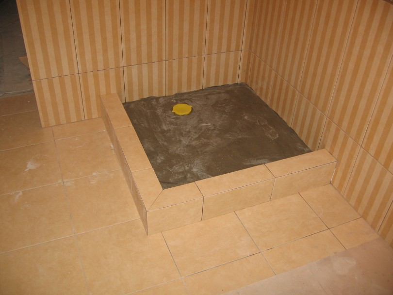 Облицовка плиткой при наклоне к стене не представляет больших сложностей. Но при наклоне пола в центр, плитку придется резать под определенным углом. Но в таком случае лучше применять мелкую мозайку.