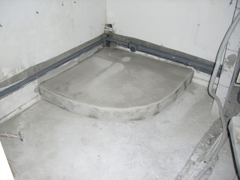 Перед заливкой бетона, нужно провести работы по гидроизоляции. Для этого лучше применить жидкую гидроизоляционную мастику. Она наносится не только на пол, где будет стоять поддон, но и на стены покрывая всю площадь попадания воды на стены.