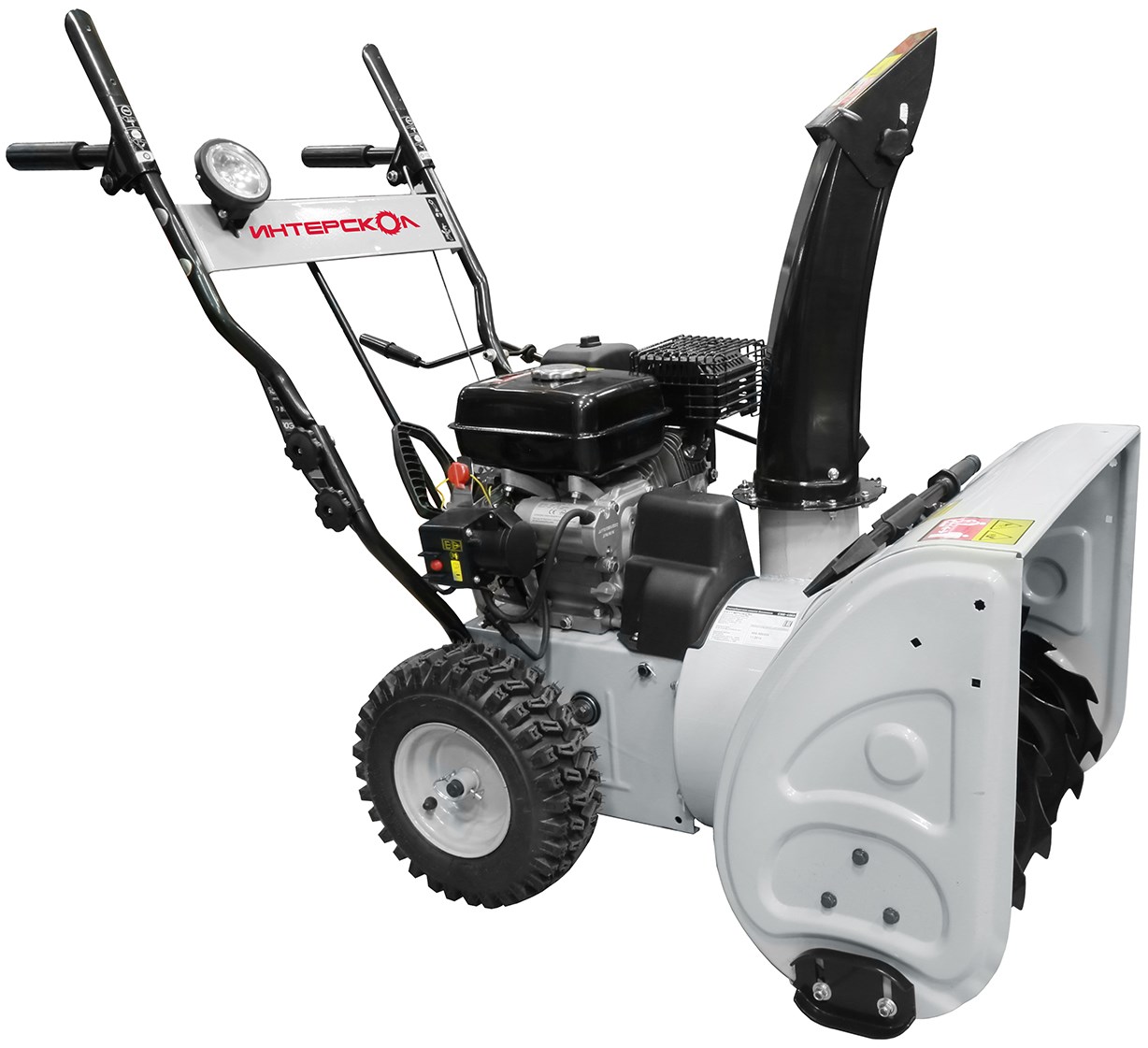 Рассмотрим следующий пример продукции: Интерскол снегоуборочная машина с индексом СМБ 550. Она обладает двухступенчатой системой. Шнек представлен, в качестве зубчатой ленты. Машина обладает высокой эффективностью выброса снега и высокой производительностью снегоотбрасывателя. На шинах колес имеются грунтозацепы, эффективность работы которых достаточная для обеспечения хорошего сцепления с рыхлым, влажным снегом или же слежавшимся настом. Для комфортной работы в темное время суток спереди на машине закреплен светодиодный фонарь, освещающий путь пользователю, ведущему снегоуборщик.