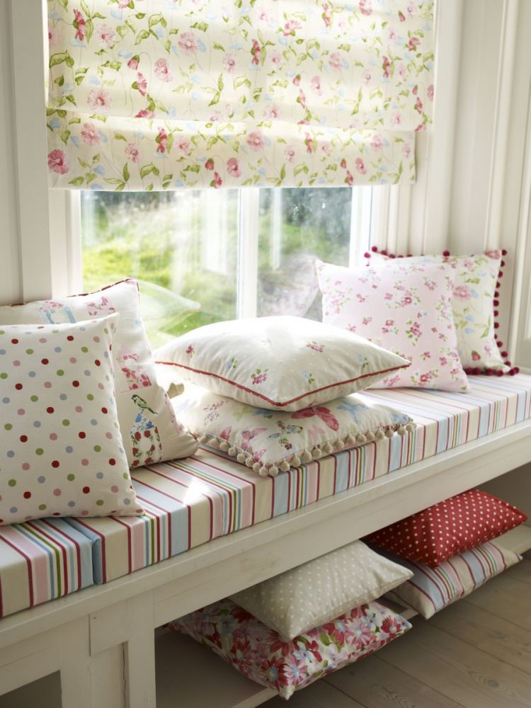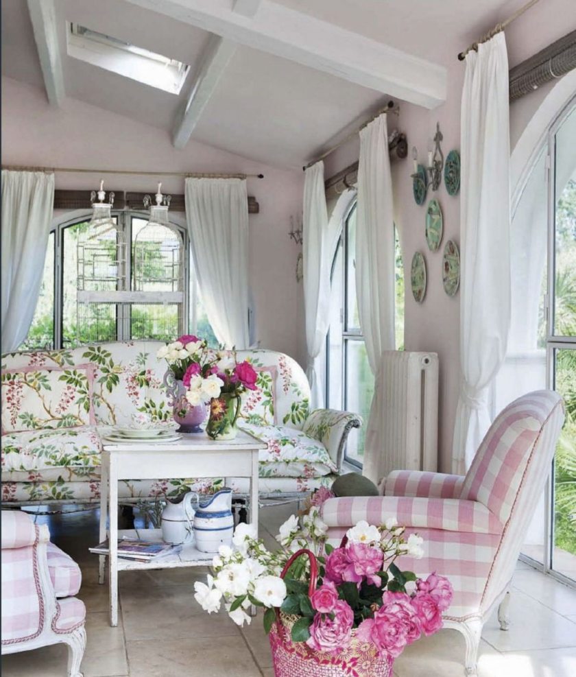Основная расцветка — светлые тона, как пример, белый, бежевый. Чтобы создать деревенский стиль, нужно выбирать ткань с таким рисунком, как полоска, клетка, горох, цветы.