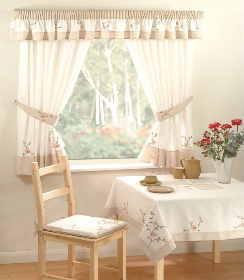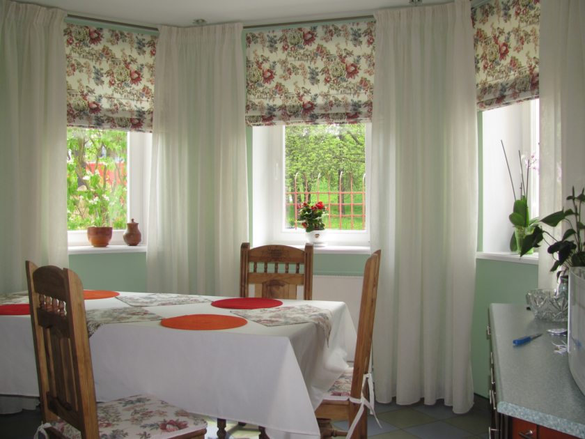 Наглядный пример – шторки в поездах. Они расположены таким образом, что закрывают только половину окна – веревка или перекладина находится не над оконным проемом, а посередине. Состоят такие занавески из одной или двух частей. Для русского варианта можно дополнить их рюшей или вышивкой, выполненной своими руками.