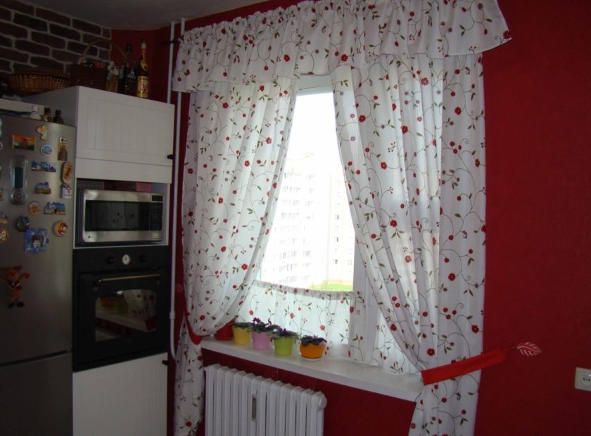 Используются окна на кухне чаще всего как полка, и потому не практично использовать длинные шторы