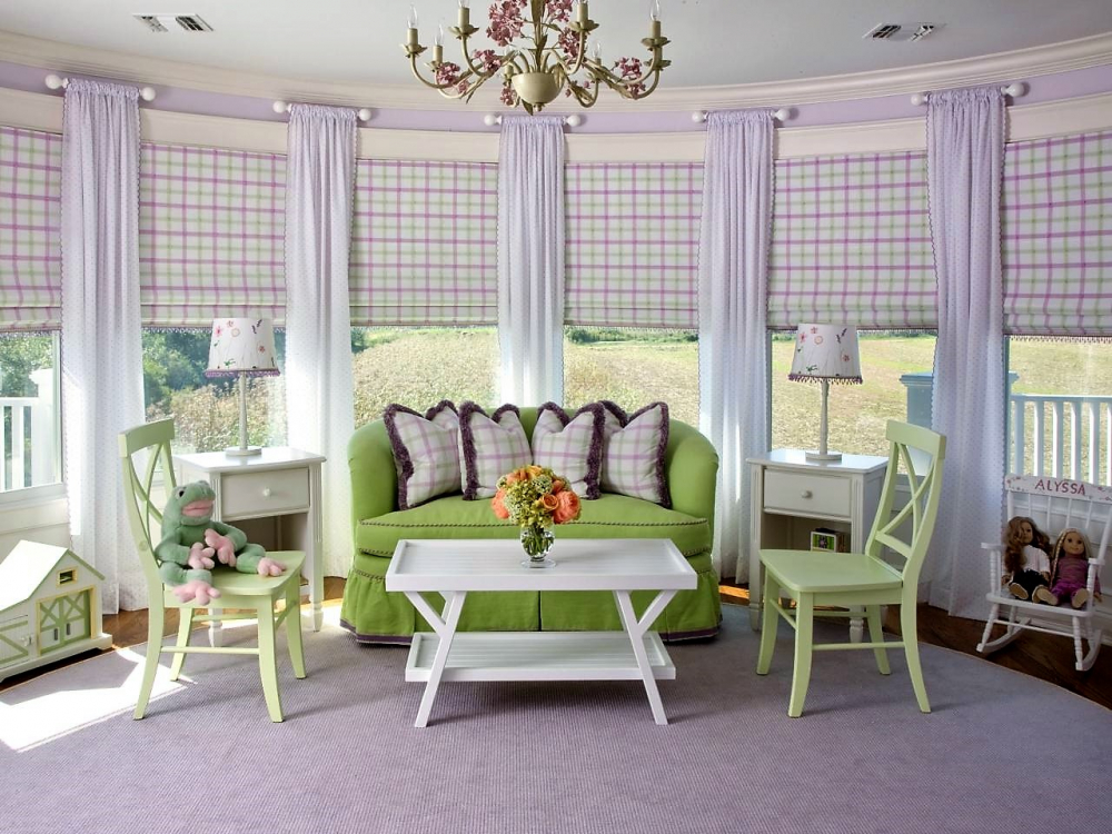Очень популярными для таких интерьеров считаются шторы в клетку. При этом цвет таких занавесок может быть любым. Отличительной чертой занавесок в подобном стиле является то, что яркие квадраты печатаются всегда на белом или бежевом фоне.