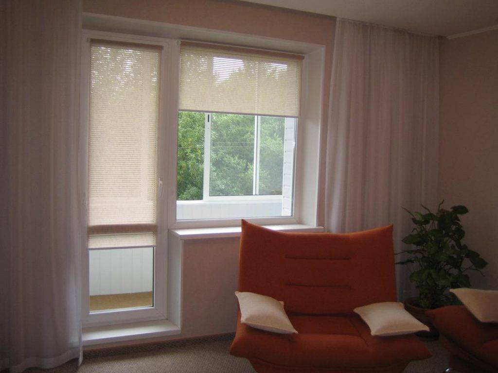 Римские и рулонные шторы прекрасно подходят для декорирования окон на самом балконе. В таком случае необходимость в плотных портьерах для гостиной автоматически отпадает. Как видно на фото ниже, такие шторы прекрасно комбинируются и с тюлем, и с портьерами.