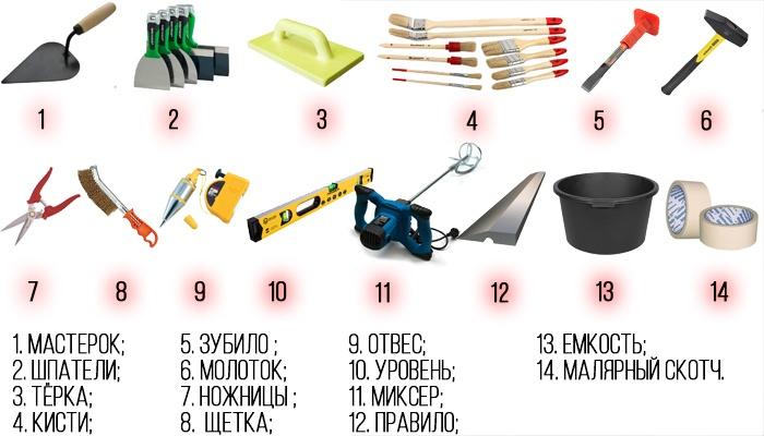 Чтобы правильно произвести штукатурку на улице, смеси для кирпичных стен недостаточно. Необходимо также правильно подобрать инструменты. Среди необходимых приспособлений выделяют: