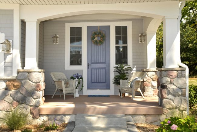 В доме без тамбура конструкцию крыльца выбирают так, чтобы ограничивать движение холодного воздуха в дом. Для этого крыльцо обязательно защищают от ветра.