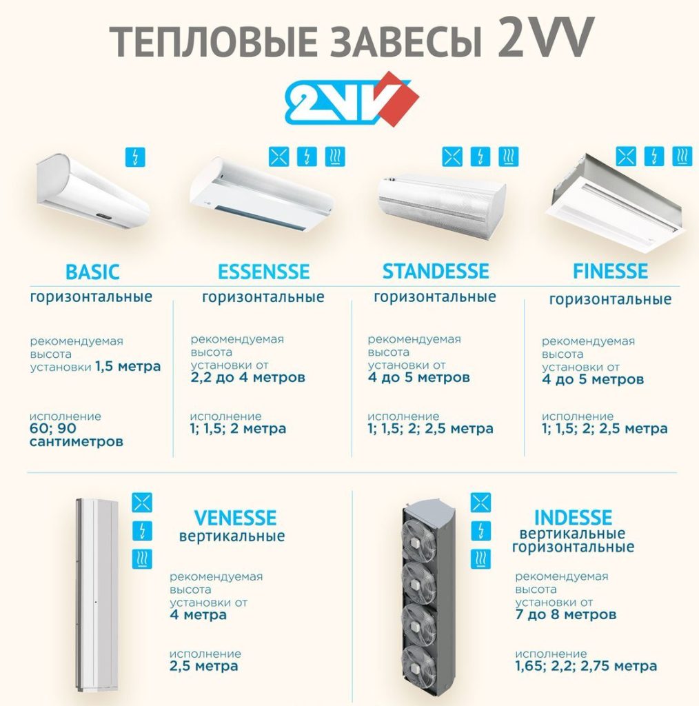 - Возможность выбора завес с различными источниками тепла: электричество, вода, газ и без нагрева.