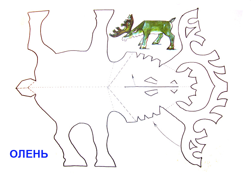 - Шаблон вырезается и по пунктирным линиям и сгибается. Проще всего скрепить детали прозрачным скотчем.