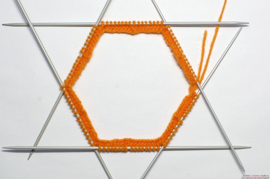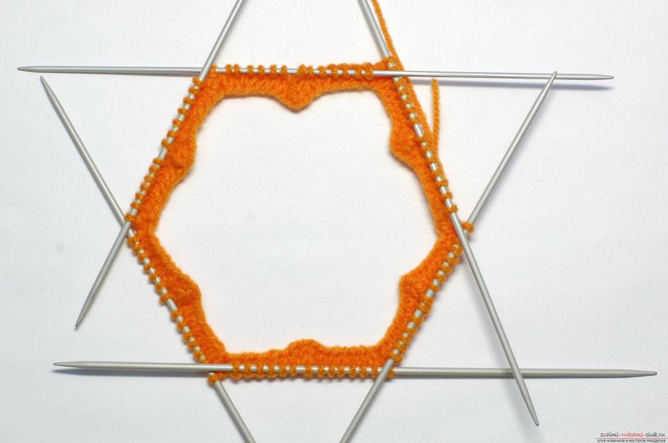 Набираем 108 петель и распределяем их на шесть спиц. Выходит по 18 петель на каждую спицу. после чего замыкаем спицы кольцом. Вязание такой подушки аналогично вязанию носков или варежек. Теперь нужно вязать по кругу.