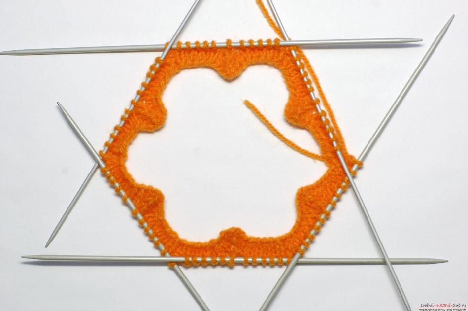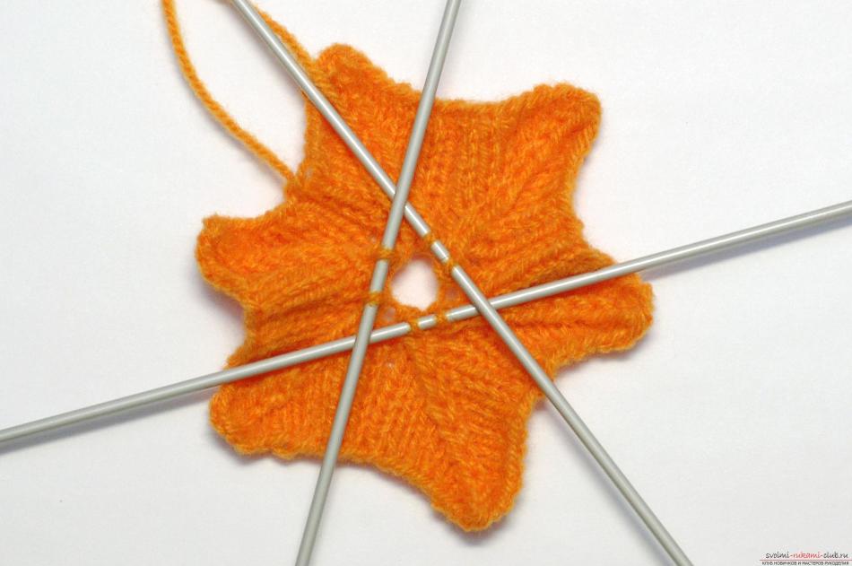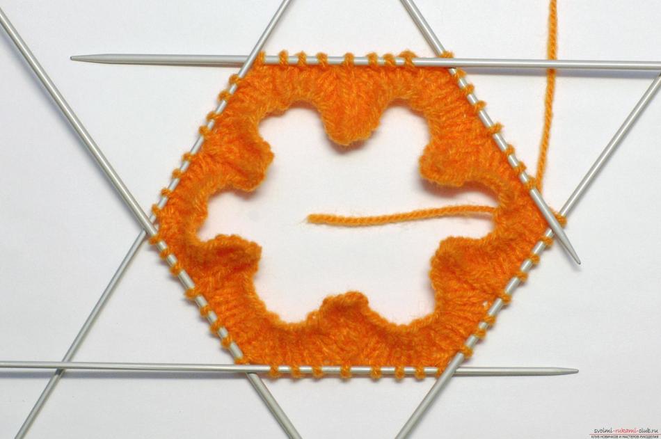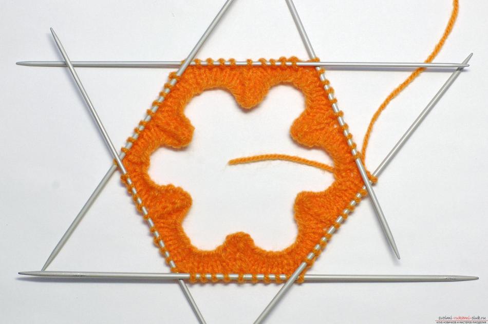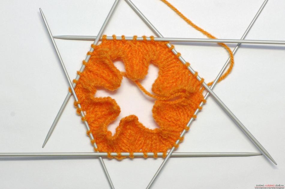 - Количество петель уменьшилось в два раза, а если считать уменьшение петель по всему ряду, то оно составит 12 петель. В том месте, где мы делаем протяжки, постепенно формируется красивая выпуклая косичка, разделяющая луч на 2 половины.