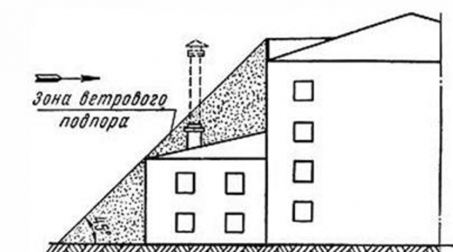 Вылет дымовой или вентиляционной трубы над кровельным покрытием устанавливается нормами СНиП по совершенно иным соображениям. Если посмотреть на рекомендованную СНиП схему установки выводов, то становится понятным, что срез вентиляционного и дымового канала должен находиться на уровне самых быстрых воздушных потоков. Чем выше скорость воздуха, тем сильнее тяга, и наоборот, – в штиль система вентиляции работает крайне неудовлетворительно.