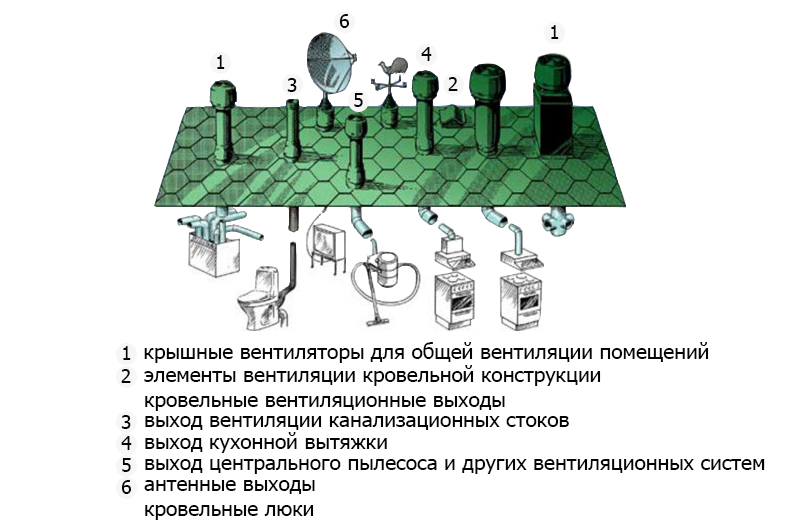 - желательно не объединять несколько вентиляционных проходов в один, а для каждой части помещения (вытяжки на кухне, стояка канализации, жилых помещений, чердака) делать отдельный вертикальный проход на крышу;