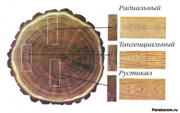 Данный тип отличается тем, что инструмент проходит до сердцевины, не затрагивая ее, через годичные кольца. Отличить бруски такого распила можно по выраженной текстуре и волнообразный рисунок, образующийся от годовых колец. Гитары с таким грифом обычно стоят гораздо дешевле, однако этот тип больше подвержен усушке и менее стабилен.