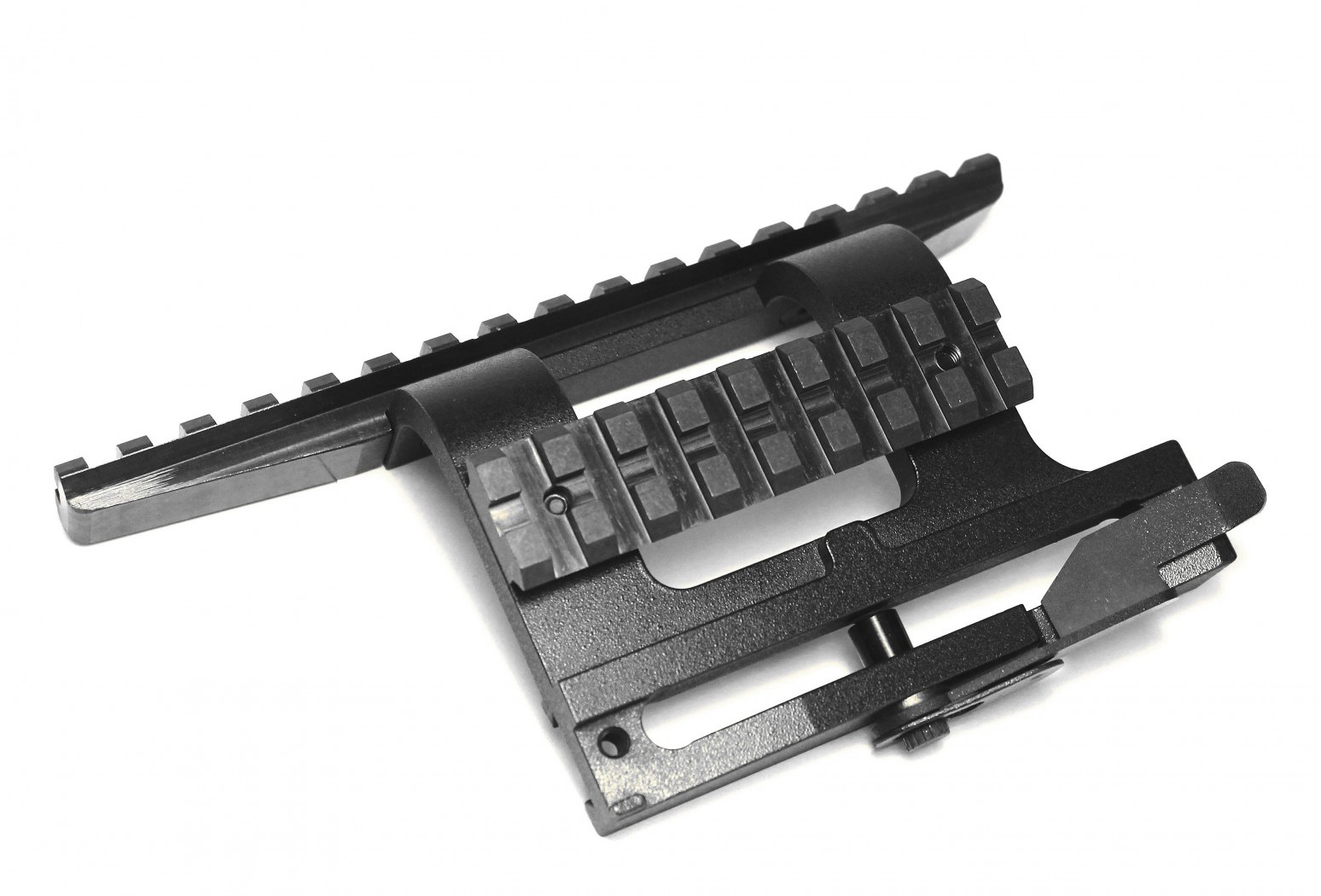 Конструкция разъемного типа и состоит из двух частей. Подходящее место для кронштейна – боковая зона вентилируемой планки. Эта особенность расположения позволяет без помех использовать стандартные прицельные устройства и при снятой прицельной оптике. Крепежная конструкция для оптических прицелов должна подходить к конкретным маркам оружия. Стандартные прицельные приспособления подбирают в соответствии с рекомендациями профильных специалистов.