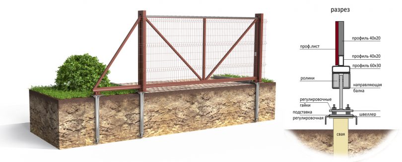 Также некоторые пользователи интересуются, как можно установить откатные ворота. Для монтажа вам нужно будет вкрутить несколько коротких винтовых опор, а затем приварить швеллер. К самому швеллеру привариваются ролики, по которым будет перемещаться полотно.
