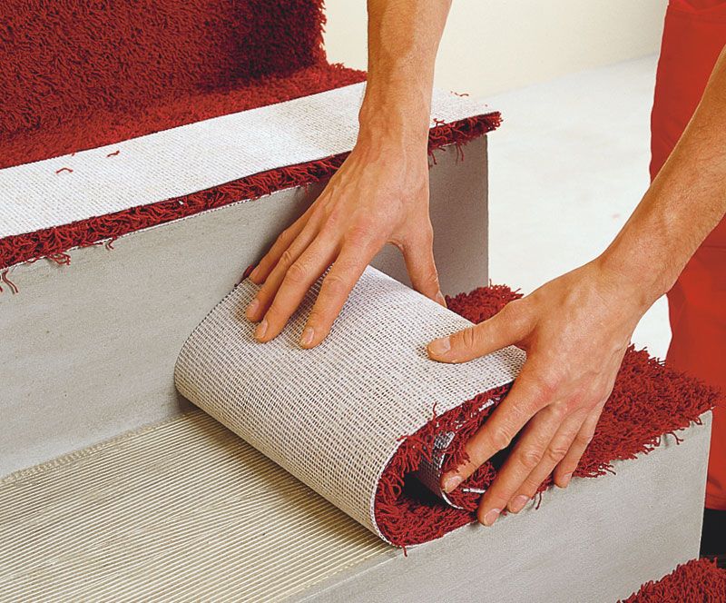 Монтаж ковродержателей достаточно прост. Необходимо постелить ковровое покрытие, тщательно расправить его, не оставляя складок. Затем следует уложить подготовленный дюральалюминиевый стержень на каждом стыке ступенек и по бокам прикрепить его металлическими дугами к лестнице.