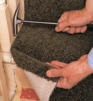 Закрепить покрытие можно при помощи ковродержателей, монтаж которых наносит минимальный вред ковру и лестнице, а изготовление вполне доступно своими руками. Ковровое покрытие надёжно фиксируется на каждой ступени лестницы. Технология может использоваться для лестниц из любого материала и любой конструкции.